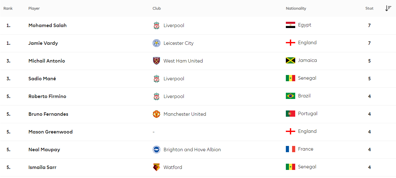 الأكثر قراءة الأن. يتصدر محمد صلاح لاعب فريق ليفربول جدول ترتيب هدافي الدوري الإنجليزي الممتاز بعد مرور 5 جولات بالتساوي مع برونو فيرنانديز ماهجم مانشستر يونايتد وميكائيل أنطونيو.